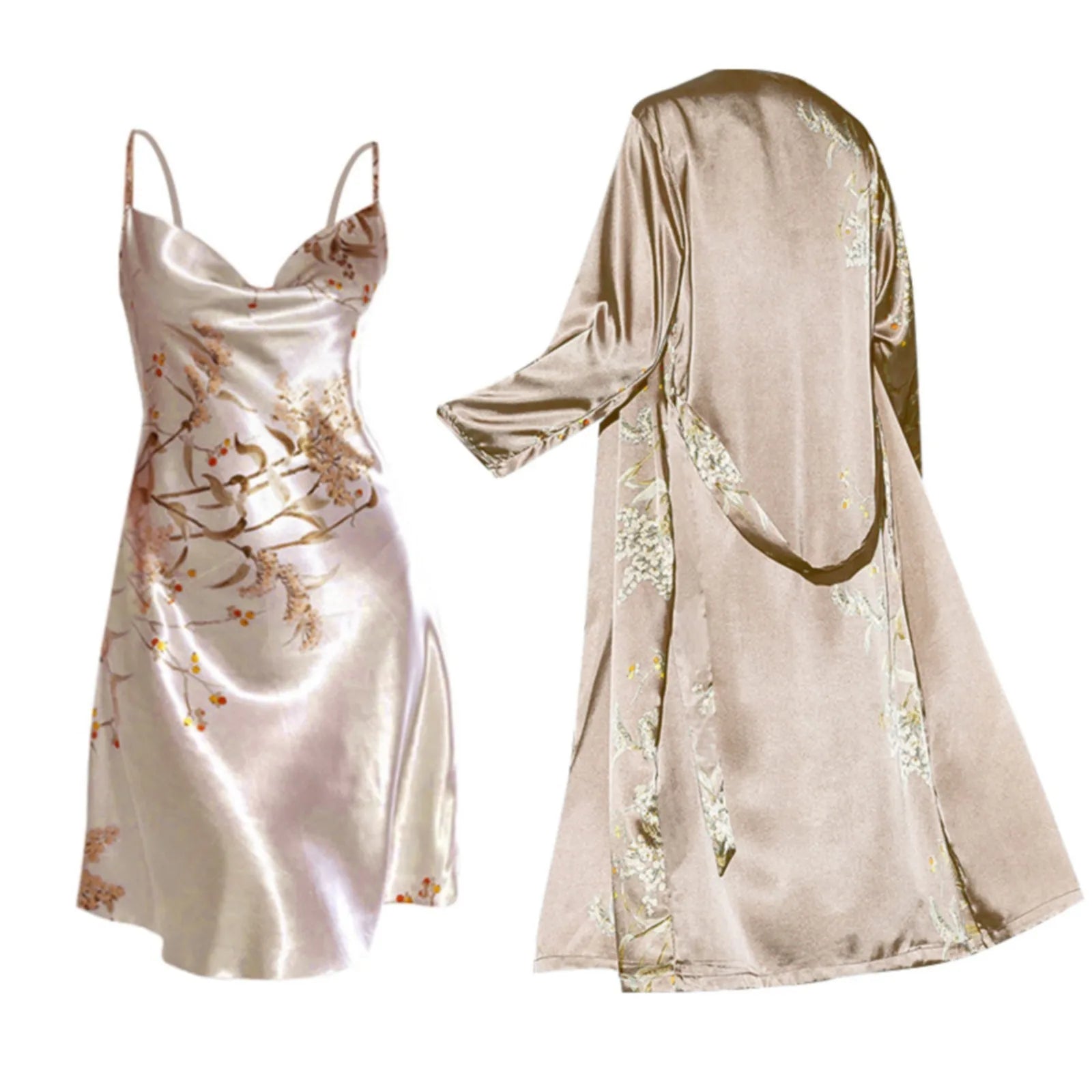 2 PC Robe Sets Luxury Vintage Printed Women Cowl Neck Sleeveless Nightgowns With Long Sleeve Cardigan Women Kimono Home Clothes