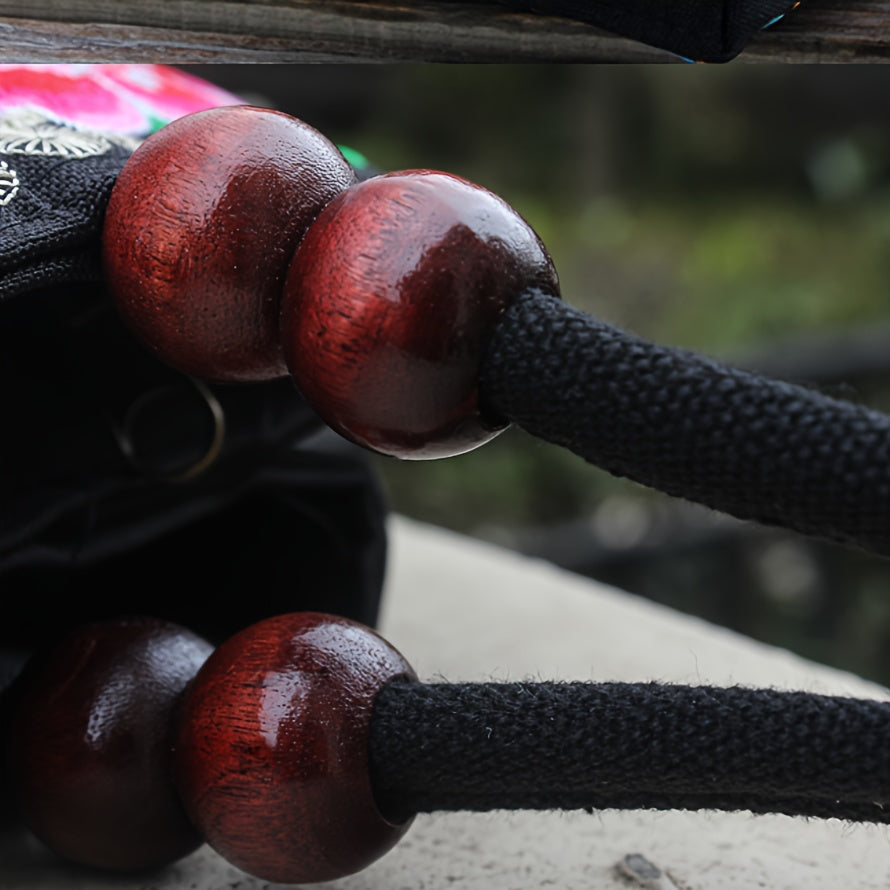 Ethnic Style Double-Sided Embroidered Handbag with Wooden Bead Handles & Dual Zipper Closure - Vibrant Floral Mandala Design on Durable Fabric Purse for Women, Casual & Formal Events, Intricate Embroidery