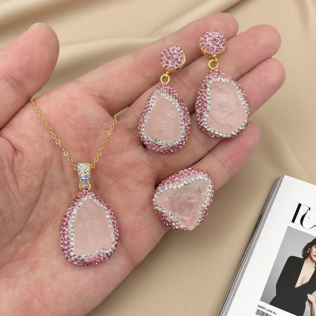 Healing Crystal Jewelry Set Rough Natural Pink Crystal Necklace Earring Ring for Women Handmade Raw Quartz Stone Wedding Gift