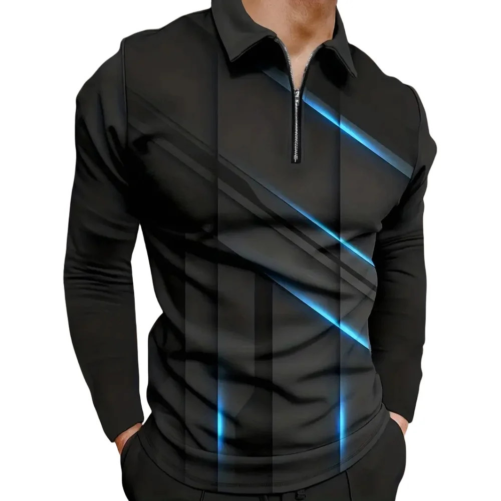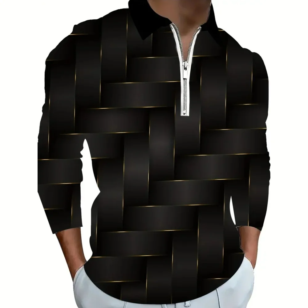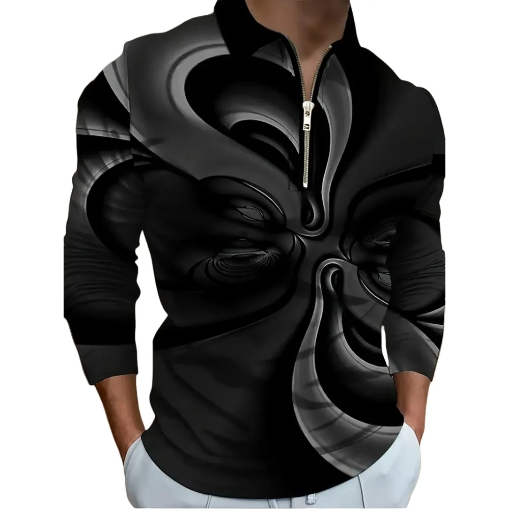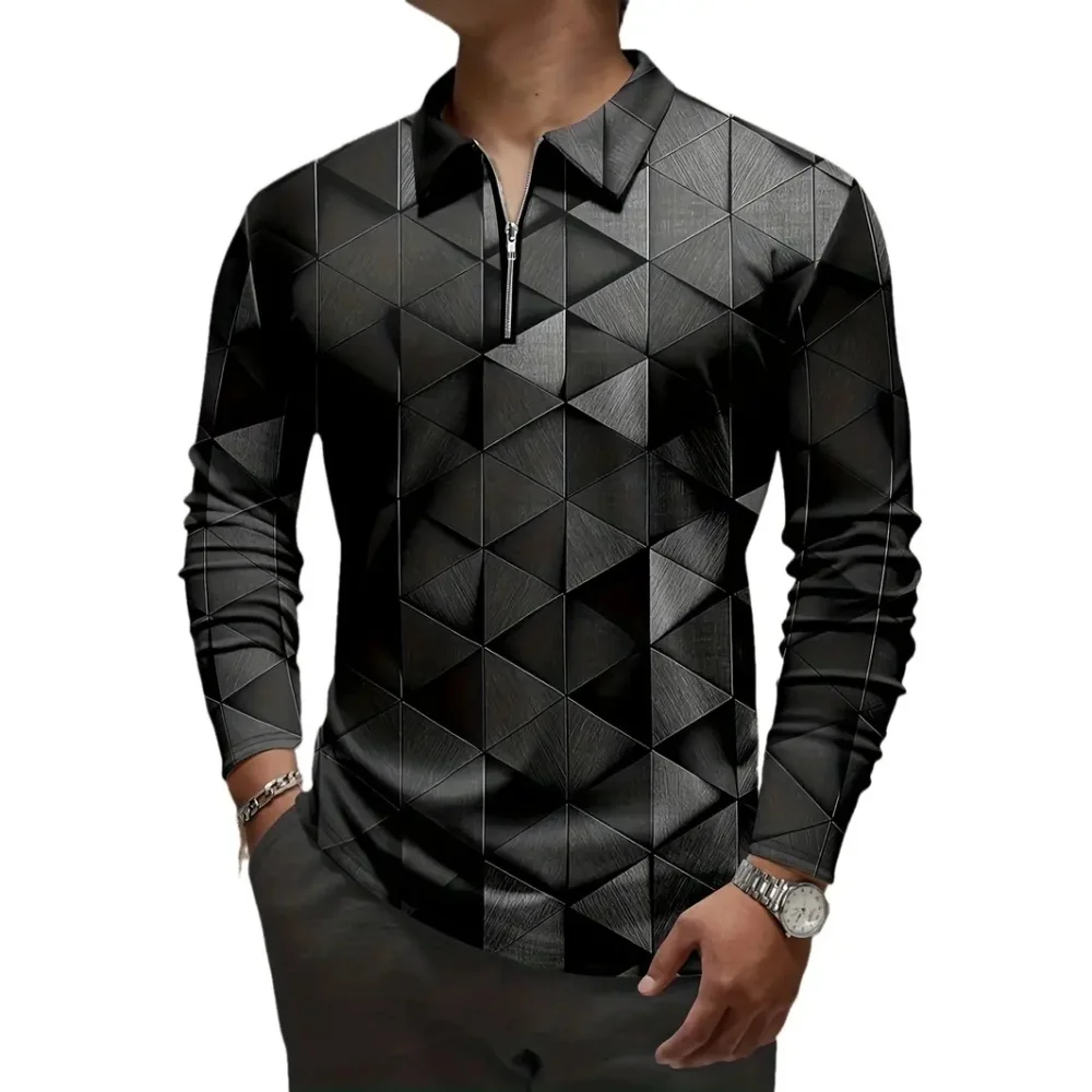 Mens Polo Shirts Cool 3D Geometric Print Casual Lapel Golf Wear Men's T-Shirt Tops Street Sports Zipper Long Sleeve Men Clothing