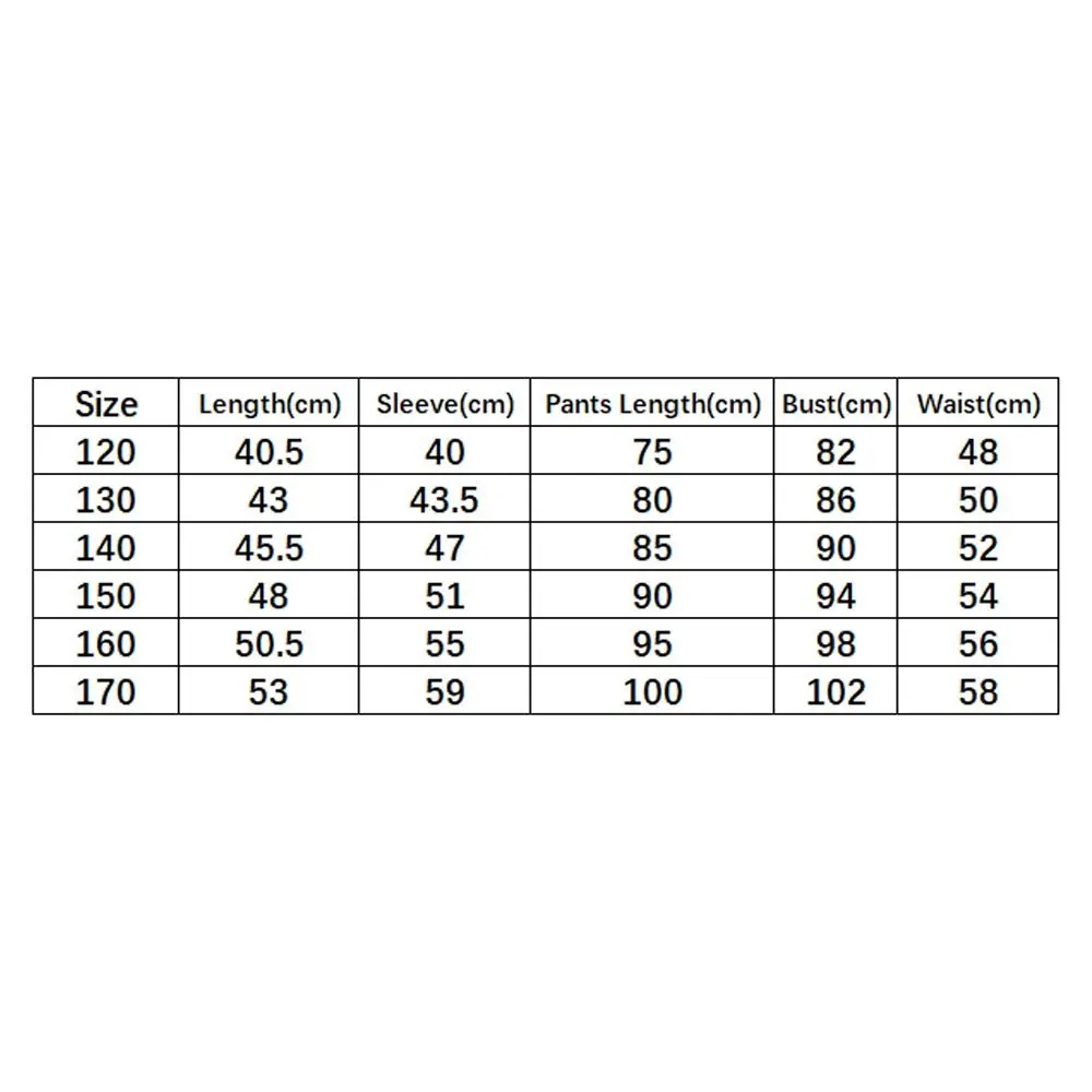 Size120: Length:40.5cm(15.94in),Sleeve:40cm(15.75in),Pants Length:75cm(29.53in),Bust:82cm(32.28in),Waist:48cm(18.90in)