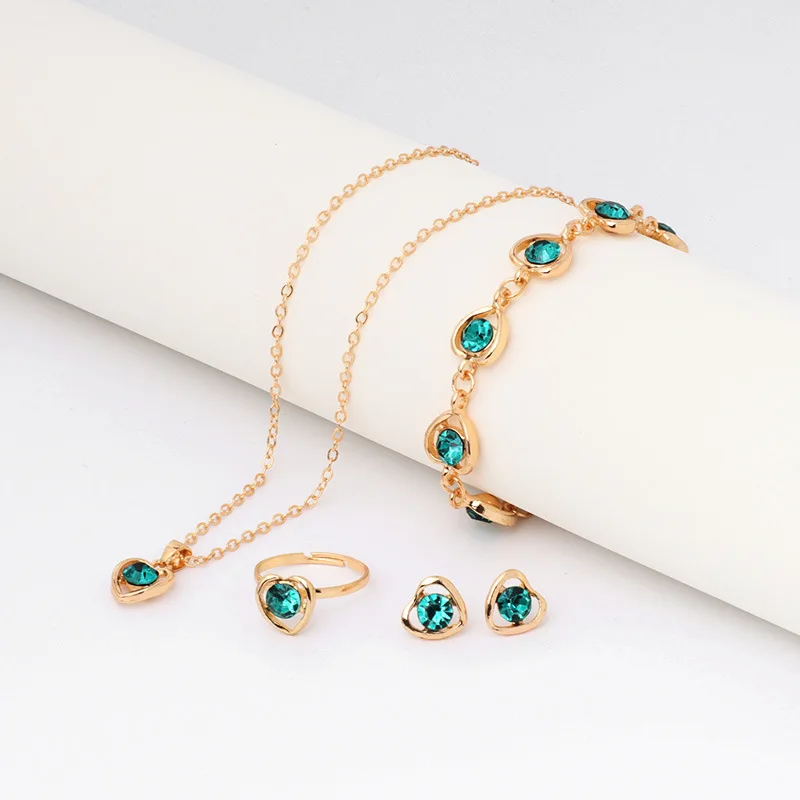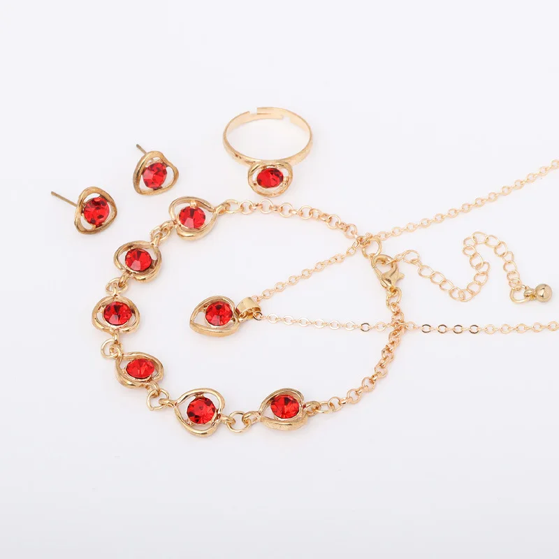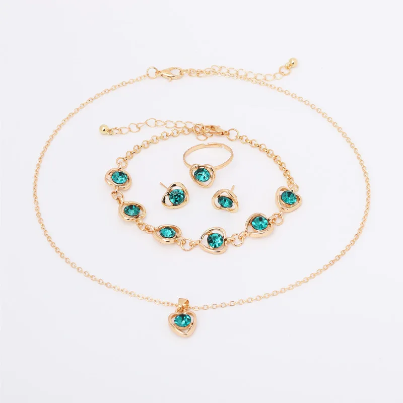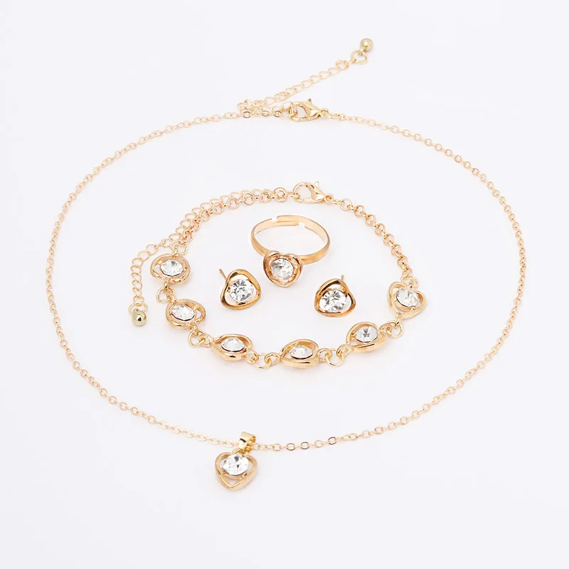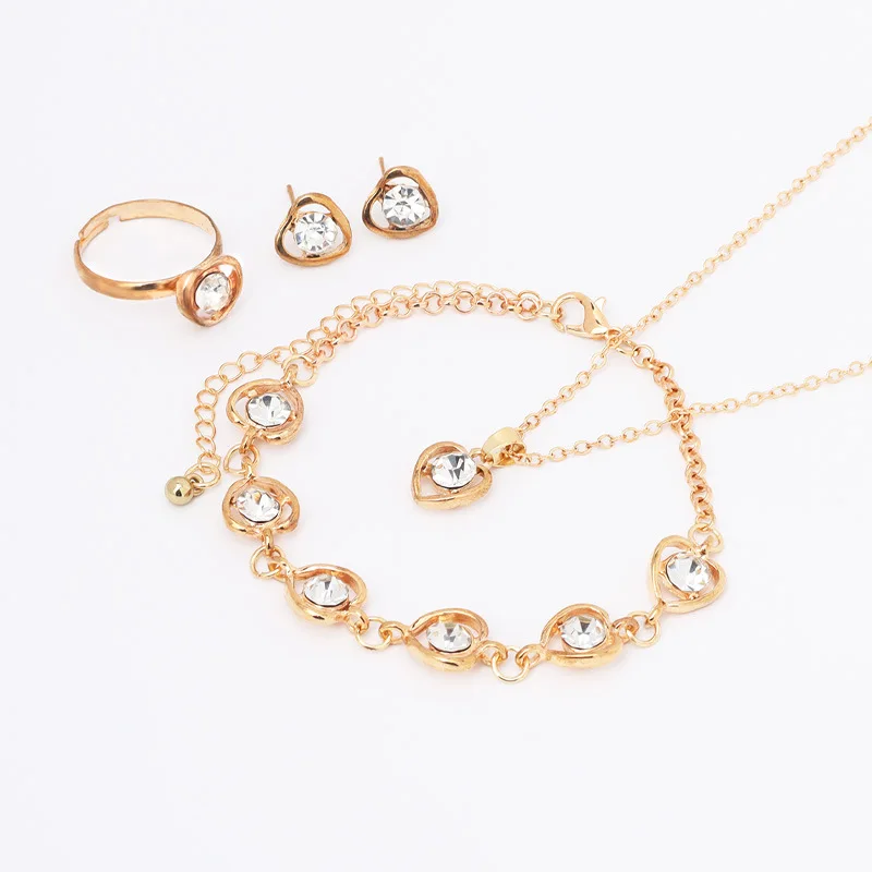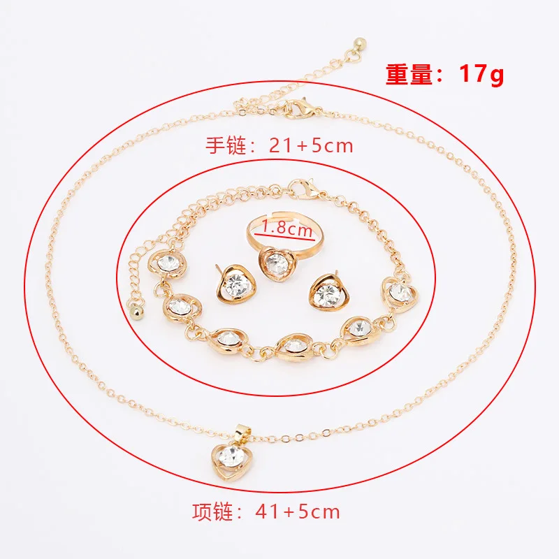 Women Crystal Love Jewelry 4 Piece Set Fashionable Elegant High End Peach Heart Necklace Earrings Rings Bracelets Necklace Set